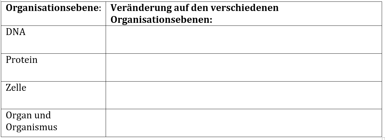2. Stelle z.B. in Form einer Tabelle dar, welche Veränderungen sich bei der Erbkrankheit der Sichelzellenanämie auf den verschiedenen Organisationsebenen ergeben.